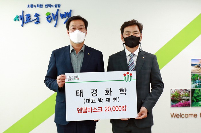 [로컬세계 박상진 기자]강원 태백시는 지난 4일 철암농공단지 소재 태경화학에서 시를 찾아 코로나19 극복을 위한 마스크 2만장(220만원 상당)을 이웃돕기 성품으로 기탁했다고 6일 밝혔다.