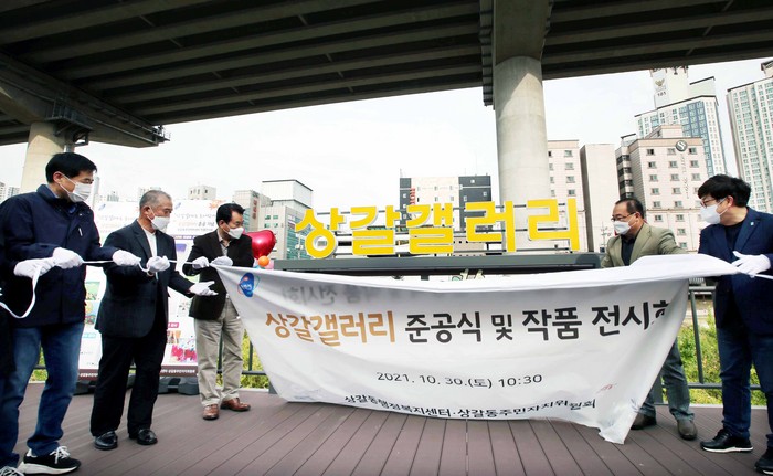 | ▲백군기 용인시장이 상갈갤러리가 조성된 것을 축하하며 관계자들과 제막을 걷어내고 있다. |