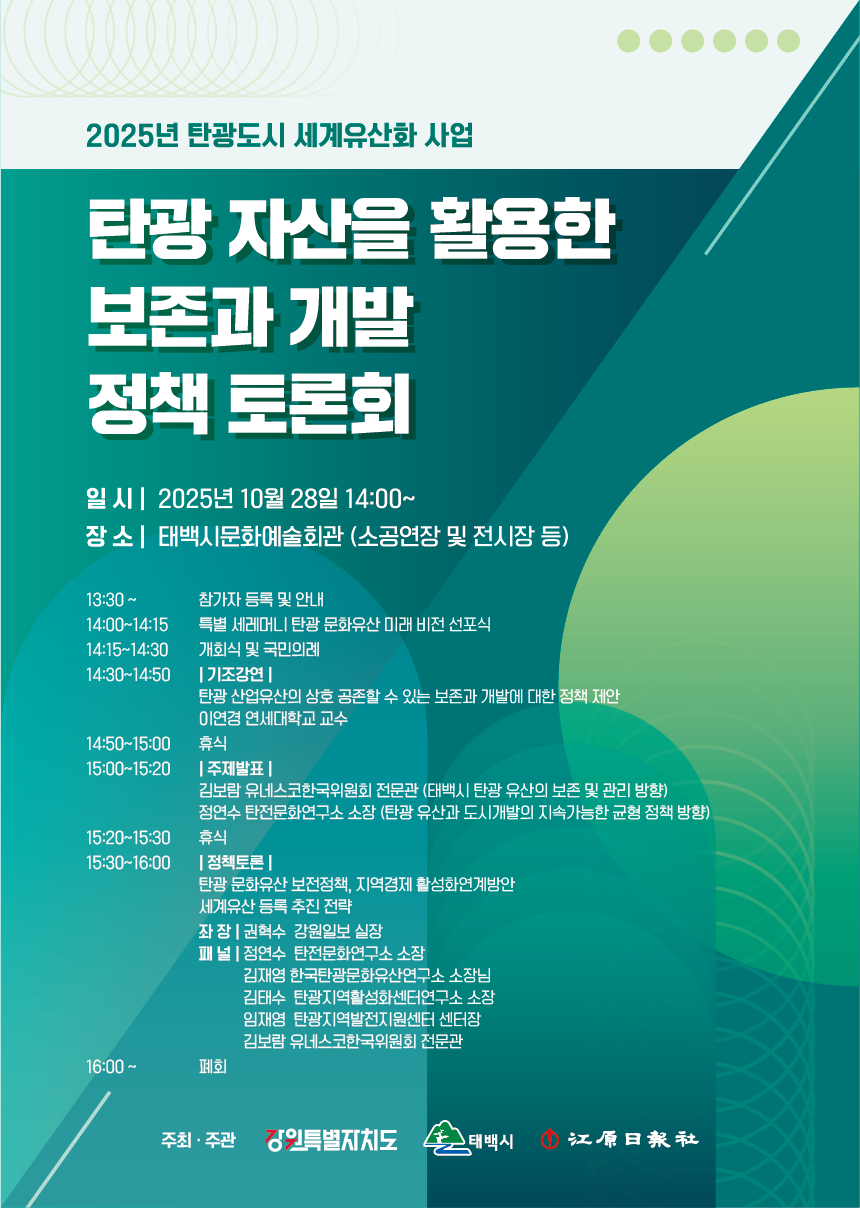 시 관계자는 “이번 정책토론회는 태백시 산업유산의 역사적 가치를 재조명하고, 미래세대와 함께 이어갈 새로운 비전을 모색하는 자리”라며 “많은 시민들의 관심과 참여를 바란다”고 말했다.