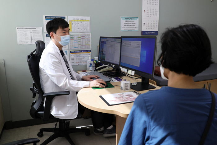 ▲강동경희대병원 소화기내과 김하일 교수가 한 환자와 진료상담하고 있다. |