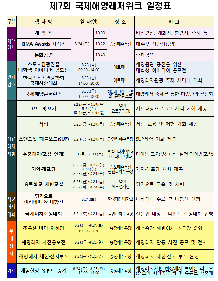 자세한 사항은 국제해양레저위크 홈페이지(www.kimaweek.org)와 ‘바다야 놀자(KIMA Pass)’ 앱에서 확인할 수 있다.