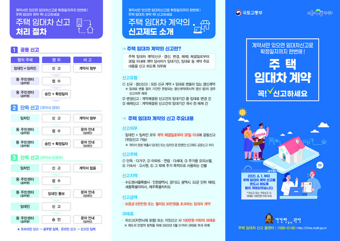 구는 새롭게 시행되는 제도에 대한 구민들의 이해를 돕기 위해 주택 임대차 신고제의 주요 내용을 담은 리플릿을 제작, 지역 내 21개 동 주민센터 및 구청 민원실에 비치했다.