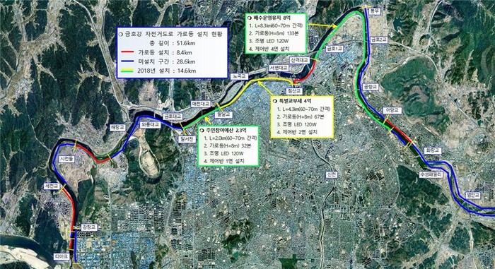 아울러 신천과 하중도를 연계하는 총 거리 25㎞ 구간에도 가로등이 설치돼 야간에도 안전하게 자전거도로를 이용할 수 있는 새로운 도시의 명소로 자리잡게 될 것으로 기대된다.