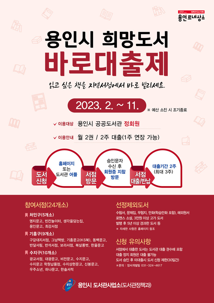 올해 희망도서 바로대출제에 참여하는 서점은 처인구의 명지문고(역북동), 빈칸놀이터(마평동), 생각을 담는 집(원삼면), 용인문고(김량장동), 최강서점(포곡읍) 등이다.