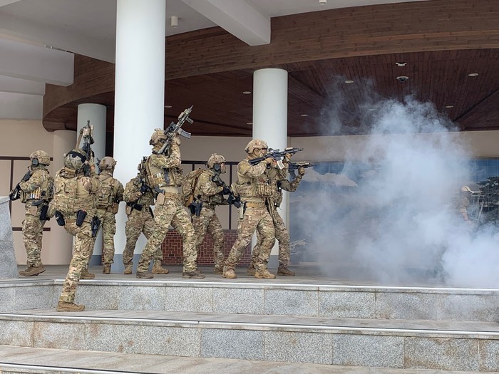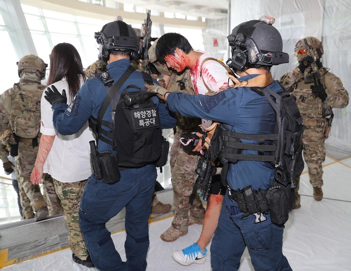 이날 훈련엔 해군특수전전단이 함께 참가했으며, 인천‧경남지방경찰청 특공대원들이 참관해 5개 기관 40여 명이 투입됐다.