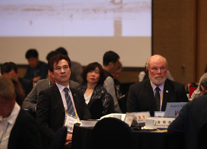 | ▲주제연설을 경청하고 있는 서철모 화성시장(왼쪽)과 피트 프로바스코 EAAFP 의장. |