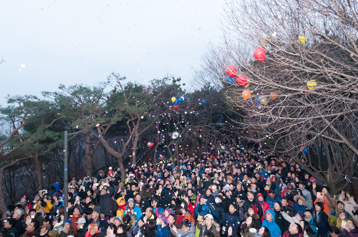 ▲지난해 용왕산 해맞이 행사에서 소망풍선을 날리고 있다.(양천구 제공) |