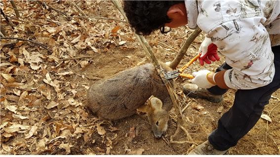 | ▲불법엽구에 걸린 고라니를 구조하고 있다.(대구시 제공) |