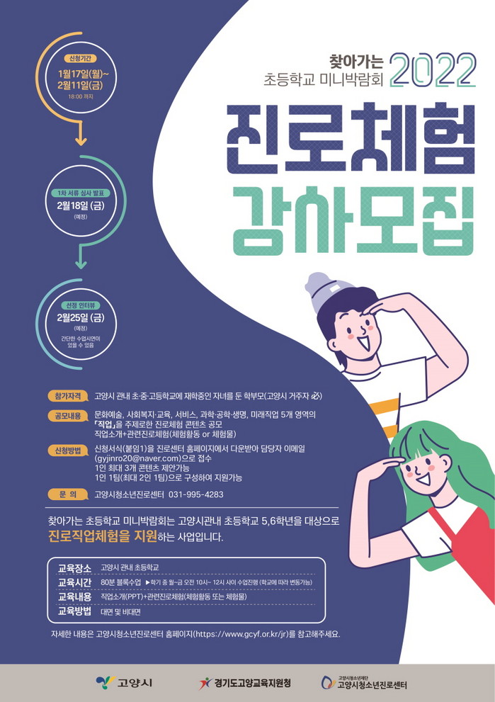 [로컬세계 강영한 기자]경기 고양시(시장 이재준)는 고양시청소년진로센터가 주관하는 ‘2022년 찾아가는 초등학교 미니박람회’ 지원을 위해 학부모 진로교육지도자(진로체험강사)를 모집한다고 21일 밝혔다.