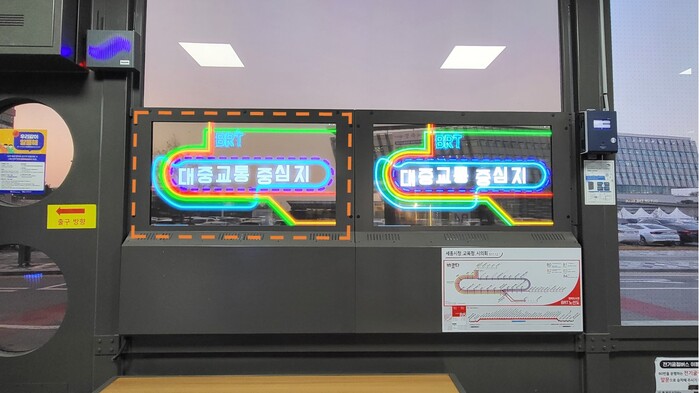 특히 투명 OLED의 장점인 40% 투과율을 활용해 창밖으로 보이는 실물 배경과 디지털 정보를 동시에 볼 수 있다. 이를 통해 공간의 개방감은 유지하면서 시민들에게 색다른 콘텐츠 경험을 제공한다. 또한, 위치정보와 공공데이터를 연계해 안전 및 긴급상황 정보를 시민들에게 알려준다.