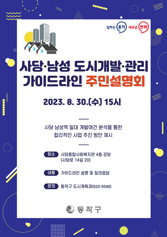 [로컬세계 = 임종환 기자]서울 동작구는 오는 30일 오후 3시 사당종합사회복지관(사당로14길 20)에서 ‘사당·남성 도시개발·관리 가이드라인’ 주민설명회를 개최한다고 25일 밝혔다.