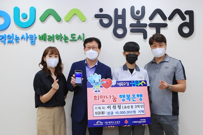 김대권 수성구청장은 “우리 수성구에 이렇게 유능한 인재가 있어 매우 기쁘다”며 “앞으로 지역사회에 기여하는 큰 인물이 되길 바라며 주변 어려운 이웃을 위해 이렇게 따뜻한 마음을 내어줘 감사드린다”고 말했다.