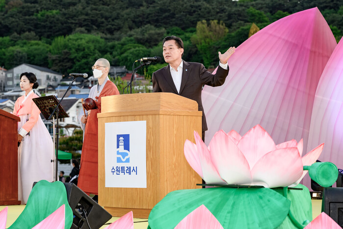 ▲ 이재준 수원시장이 2024 수원연등축제에서 인사말을 하고 있다. 수원시 제공 |