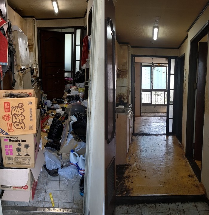 | ▲저장강박으로 쓰레기를 방치한 집 안의 청소 전후 사진. |