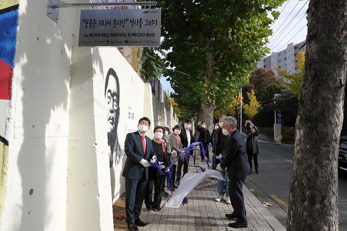 [로컬세계=박세환 기자]대구 북구청은 지난 26일 위탁운영하고 있는 대불노인복지관의 특화사업인 ‘꽃을 든 시니어 봉사단’ 활동으로 완성된 게릴라 가드닝과 벽화거리 조성 축하 기념식을 읍내정보통신학교에서 개최했다.