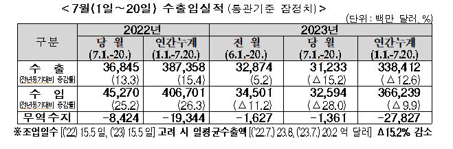 관세청은 7월 1~20일 기간 수출이 312억 달러로 작년 같은 기간보다 △15.2%(56억1000억 달러↓) 줄었다고 21일 밝혔다.