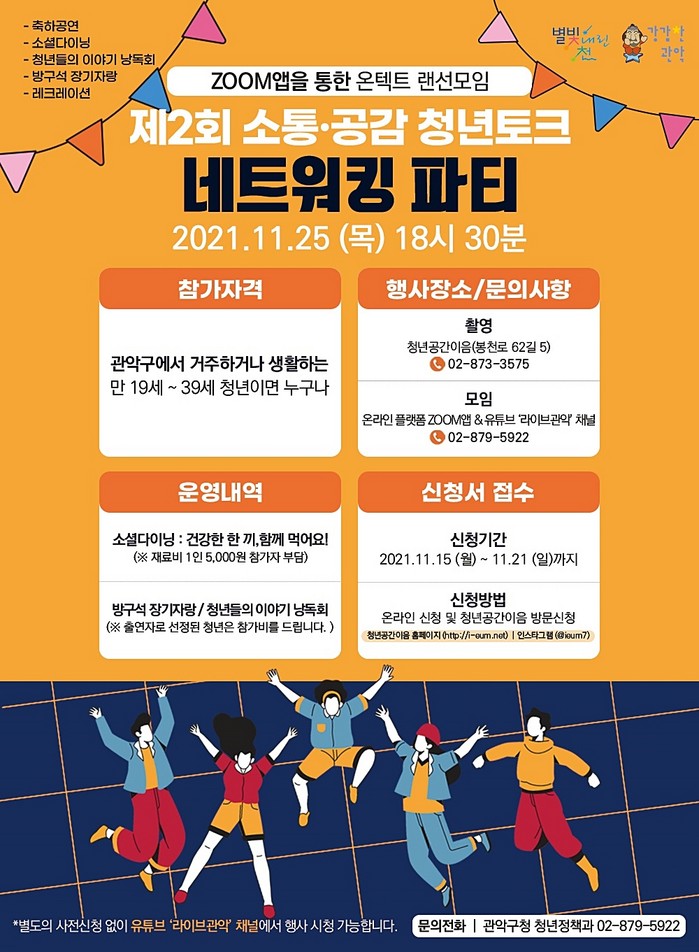 [로컬세계 임종환 기자]서울 관악구는 오는 25일 오후 6시 30분, ZOOM과 유튜브 ‘라이브 관악’ 채널을 통해 '제2회 소통.공감 청년토크 네트워킹 파티'를 개최한다고 18일 밝혔다.