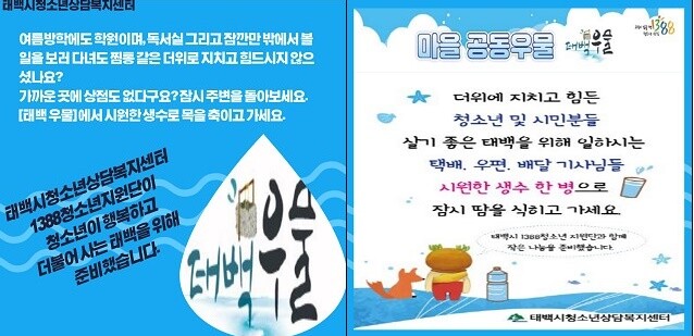 센터는 청소년, 노약자, 택배기사 등 시민이면 누구나 ‘태백 우물’ 현판이 붙어있는 지정 우물터 아이스박스에서 자유롭게 생수 한 병씩 꺼내 마실 수 있도록 준비했다.