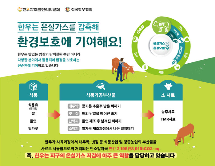 인식 개선 활동의 일환으로, 최근 한우자조금은 한우가 자연 선순환 구조로 친환경에 기여한다는 사실도 확인했다. 한우자조금관리위원회가 발주하고 전북대학교 산학협력단이 발표한 ‘저탄소 한우고기 생산을 위한 국내외 정책 및 산업적 전략분석 연구’ 결과에 따르면, 소의 사육과정에서 소가 배출하는 메탄이 자연적인 순환경로를 갖춰 환경 오염에 큰 영향이 없다는 연구 결과가 발표됐다.