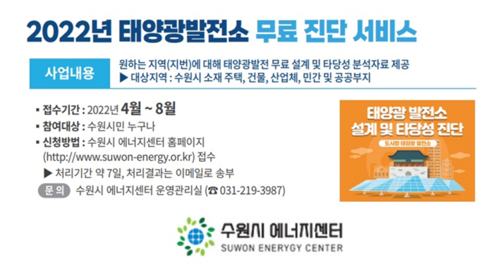 [로컬세계 김병민 기자]경기 수원시에너지센터가 8월까지 시민을 대상으로 ‘2022년 태양광 발전소 무료 진단 서비스’를 운영한다.