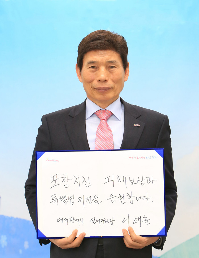 권영진 대구시장의 지명을 받은 이태훈 달서구청장은 “지진 발생 후 1년 4개월이 지났지만 포항 시민들은 여전히 그 날의 아픔을 기억하고 있다”며 “특별법 제정에 대한 많은 국민들의 관심과 참여로 그 분들이 하루 빨리 고통스러운 기억을 털어내기를 바란다”고 말했다.