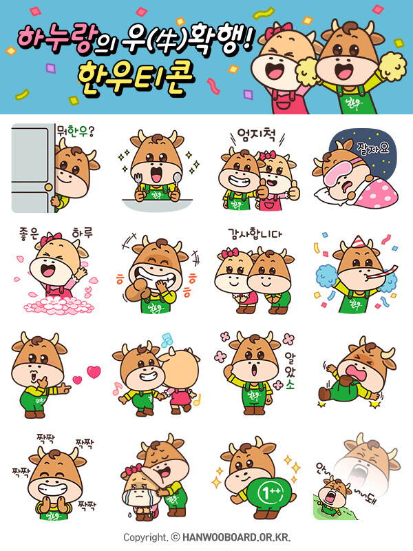 한우 캐릭터 이모티콘은 한우자조금의 공식 캐릭터 '하누랑' 캐릭터를 활용해 제작한 이모티콘으로, 지난 2019년부터 출시 때마다 빠른 시간 내에 전량이 소진될 정도로 뜨거운 인기를 얻어온 바 있다. 이 같은 인기에 힘입어 기존 배포한 이모티콘 중 소비자들에게 반응이 좋았던 모션과 신규 이모티콘을 추가해 총 16종으로 새롭게 제작했다.