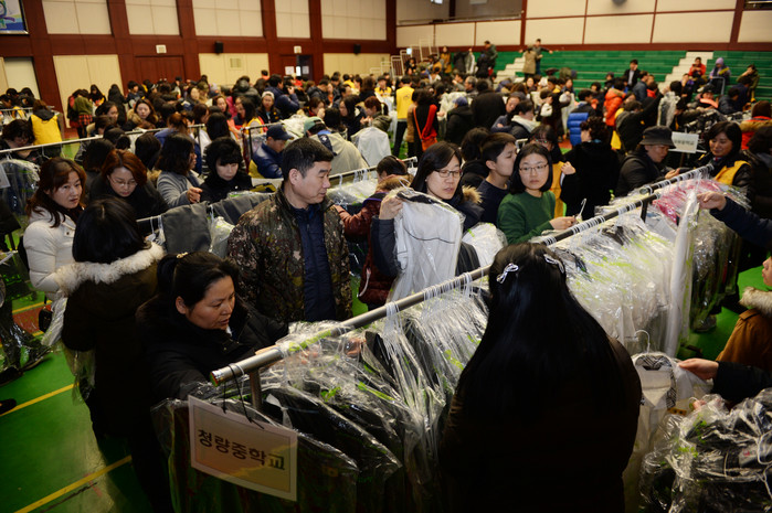 ▲지난해 열린 동대문구 교복 물려주기 나눔장터에서 학부모들이 자녀들이 입을 교복을 꼼꼼히 살펴보고 있다. |