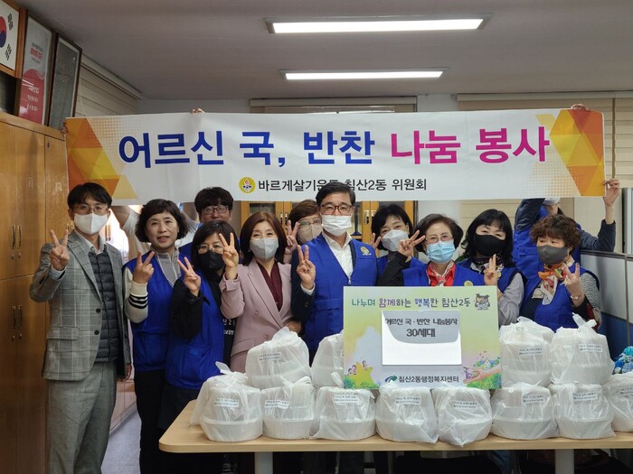 이날 침산2동 바르게살기운동위원회 회원들은 ‘어르신 국.반찬 나눔 사업’을 통해 관내 결식 우려가 있는 저소득 독거노인 가구 30세대에 직접 조리한 밑반찬과 갈비탕 등을 전달했다.