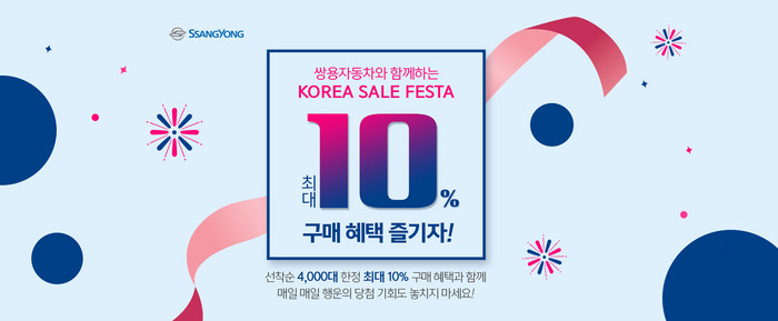 쌍용차는 11월 그랜드 세일 페스타 기간 동안 전 모델 일시불 구매 고객에게 개별소비세(3.5%) 상당 금액을 할인(렉스턴 스포츠&칸 제외)하고, 세일 페스타 해당 차량은 모델에 따라 최고 10% 할인하는 등 풍성한 구매혜택을 준비했다.