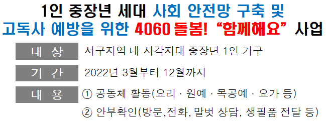 서구의 1인 가구는 44.1%로 전국 약 31.7%보다 약 12% 높은 실정으로, 이에 서구에서는 중장년을 위한 돌봄 사업의 필요성과 사회적 문제로 대두되고 있는 1인가구 고독사 예방을 위해 '4060 돌봄! 함께해요' 사업을 관내 종합복지관 2개소와 협업해 추진한다.