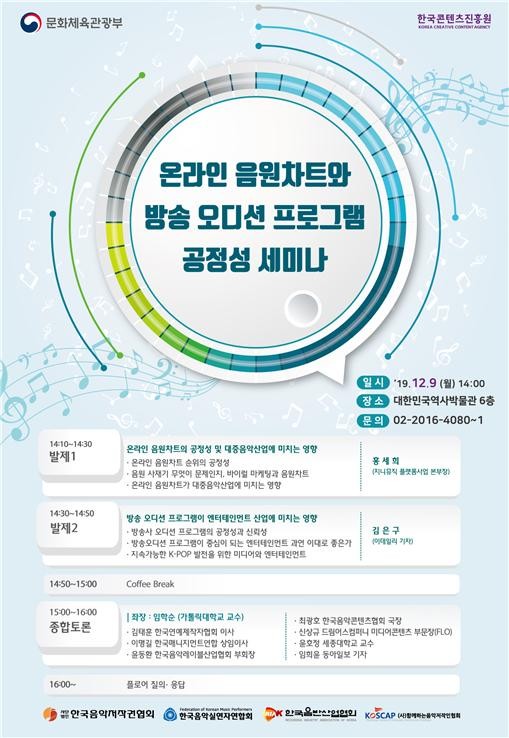 문화체육관광부와 한국콘텐츠진흥원(원장 김영준, 이하 콘진원)은 음원사재기 예방 및 방송 오디션 프로그램의 공정 환경 조성을 위한 ‘온라인 음원차트와 방송 오디션 프로그램 공정성 세미나’를 오는 12월 9일 오후 2시 서울 종로구 대한민국역사박물관에서 개최한다.