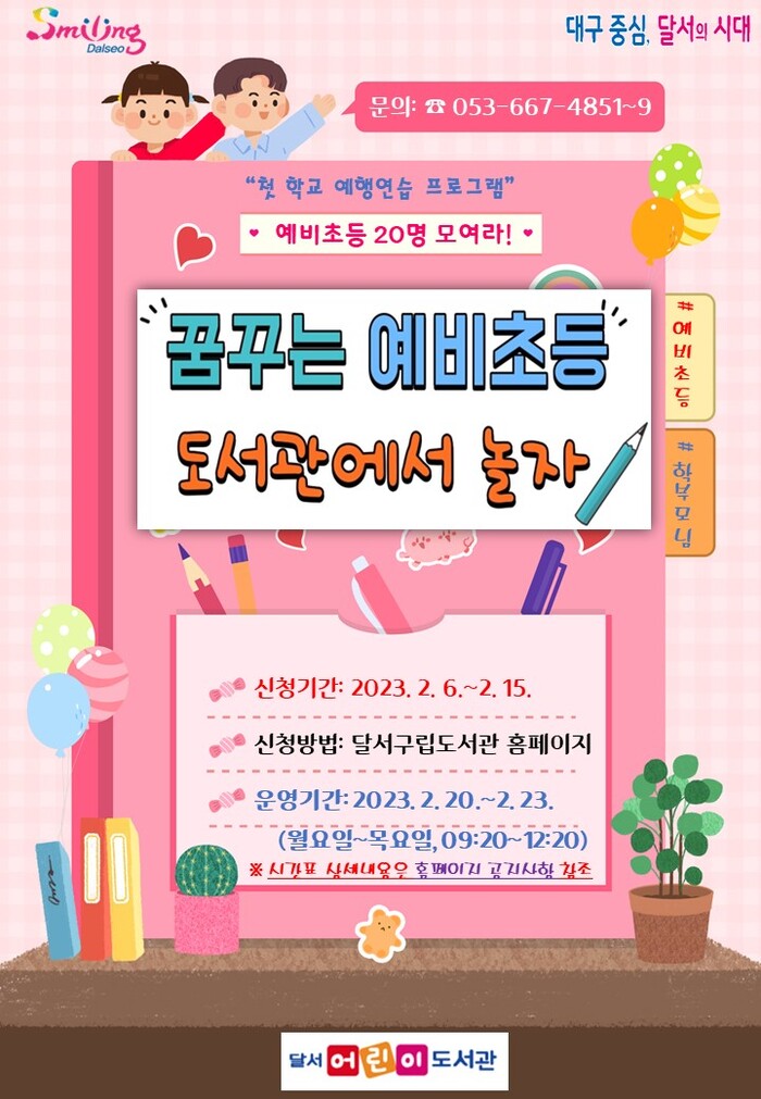 [로컬세계=박세환 기자] 대구 달서구는 6~15일까지 예비초등 및 부모 대상으로 달서어린이도서관에서 ‘꿈꾸는 예비초등, 도서관에서 놀자!’ 참여자를 모집한다.