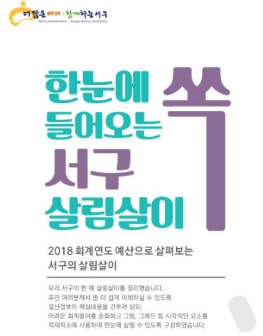 '한눈에 쏙 들어오는 서구 살림살이'는 매 회계연도마다 첨부서류를 포함해 1,000여 페이지에 이르는 방대하고 복잡한 기존의 결산서를 주민이 쉽게 이해할 수 있도록 하기 위해서 어려운 회계용어를 순화하고, 그래프와 차트 등을 활용해 시각적으로 표현함으로써 자세히 보지 않아도 한눈에 쏙 들어오도록 제작했다.