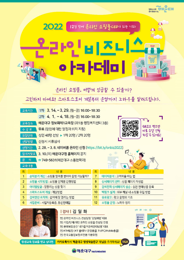 코로나19로 비대면 소비가 확대됨에 따라 구는 해운대구에 사업자 등록한 소상공인이나 창업 예정자가 온라인 쇼핑몰을 통해 상품을 판매할 수 있도록 돕기 위해 이번 아카데미를 개설했다.