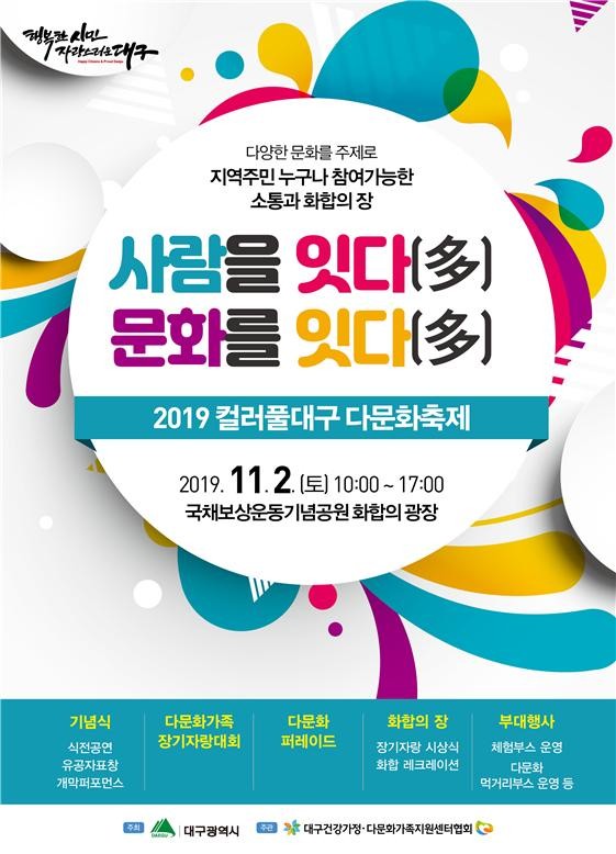 외국인주민 및 다문화가족의 꾸준한 증가로 다문화사회에 접어든 우리 지역사회가 다양성이 존중되고 포용적 사회문화가 되기를 바라는 마음을 담아 ‘사람을 잇다(多) 문화를 잇다(多)’라는 슬로건을 내걸고, 11월 2일 국채보상운동기념공원에서 개최된다.