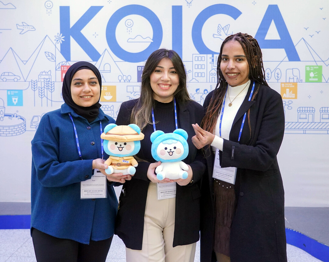 23일 경기도 성남시 코이카에서 열린 2026년 석·박사 학위연수 과정 입국 오리엔테이션에 참여한 석·박사 연수생이 사진 촬영을 하고 있다. (왼쪽부터) 파산트 하페즈(Passant Hafez, 박사과정), 하비바 라비브(Habiba Labib, 석사과정) 하나 샬랄리(Hana Shallaly, 박사과정)