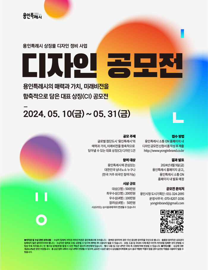 공모 분야는 용인특례시의 미래와 정체성을 담은 통합 도시브랜드 디자인으로 누구나 자유롭게 응모할 수 있다. 5월 10일부터 5월 31일까지 용인시청 누리집과 용인시 도시브랜드 소통온 누리집에 디자인 제안서 등을 작성해 출품하면 된다.
