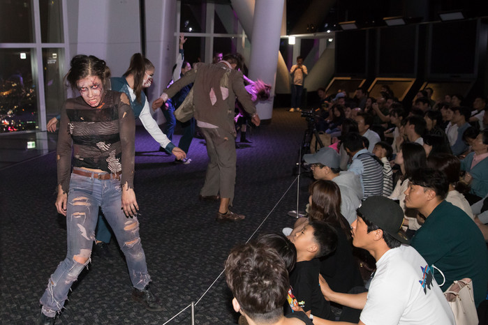 이번 공연은 ‘롯데월드 매직아일랜드를 지키는 대항군을 피해 서울스카이를 습격한 좀비들’이라는 콘셉트로 진행되며, 좀비 습격 방송이 나오면 EDM 음악에 맞춰 화려한 공연을 선보인다. 공연 후에는 좀비들과의 깜짝 포토타임도 즐길 수 있다. ‘할로윈 좀비 플래쉬몹’은 이달 30일까지 매주 일요일, 수요일 저녁 7시부터 15분간 펼쳐진다.(사진=롯데월드 제공)