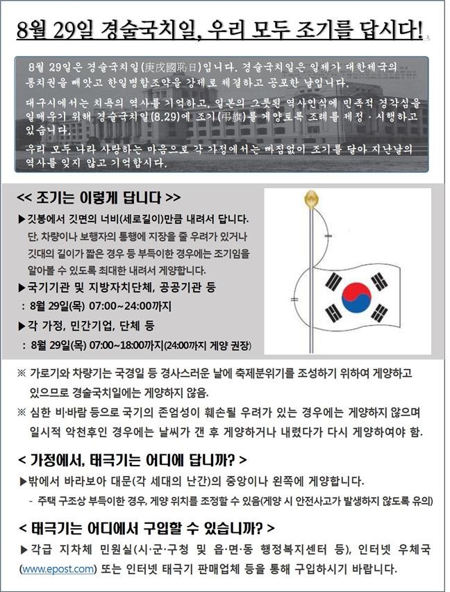 ‘경술국치’는 일제가 대한제국의 통치권을 빼앗은 한일병합조약을 강제로 체결하고 공포한 1910년(경술년) 8월 29일을 일컫는 말로, 대구시는 경술국치일을 맞아 각급 기관·단체와 가정에 조기 게양 운동을 추진한다.