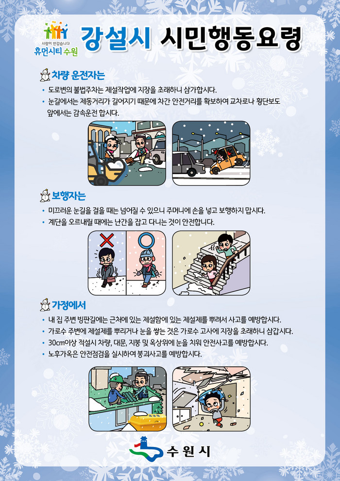 수원시는 ‘내 집, 내 점포 앞 눈 치우기 운동’과 ‘강설 시 시민행동요령’ 홍보물 1만 300매를 제작해 시·구청 민원부서와 동행정복지센터에 배부했다.