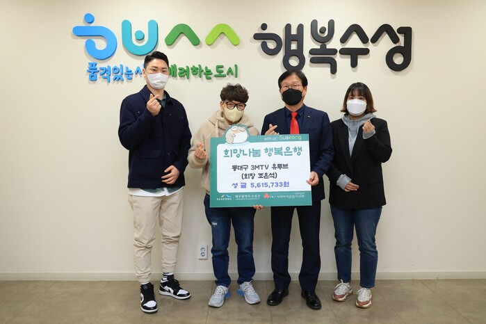 ▲ 동대구3MTV 유튜브(회장 조은석)는 지난 20일 주변의 어려운 이웃들을 위해 써달라며 성금 561만 5천 원을 수성구청에 전달 후 기념 촬영하고 있다. |