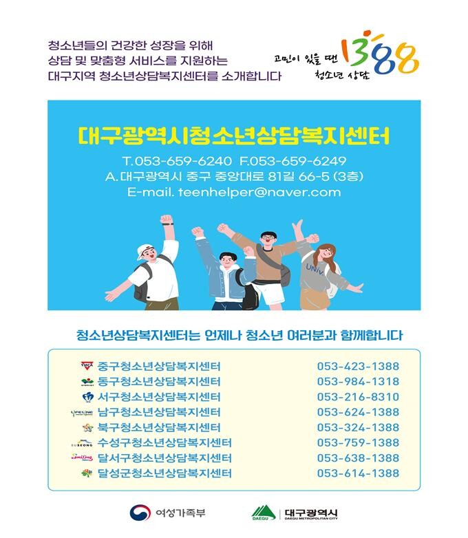 대구시와 대구시 청소년상담복지센터(이하 시 상담센터)는 다가오는 설 명절에도 지역 내 청소년들이 24시간 전문상담 서비스를 받을 수 있도록 청소년전화1388과 긴급구조 일시보호소(꿈바라기터)를 운영한다. 이를 통해 명절 연휴에도 가정 내 갈등이나 심리·정서적 어려움을 청소년 상담사와 함께 나누며 문제 해결을 위한 도움을 받을 수 있다.