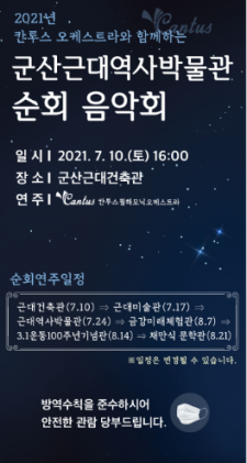 오는 10일 오후 4시 근대건축관(구.조선은행 군산지점)을 시작으로, 17일 근대미술관, 24일 근대역사박물관에서 연주회를 개최하며, 8월 중에는 7일 금강미래체험관(구.금강철새조망대), 8월 14일 3.1운동100주년기념관, 8월 21일 채만식문학관에서 연주회를 열 계획이다.