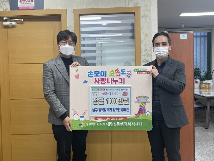 대명5동에 따르면 “이번 성금은 김효진 주무관이 평소 외부강의를 하면서 받은 강사료를 모아 100만원을 마련했다”고 전했다.