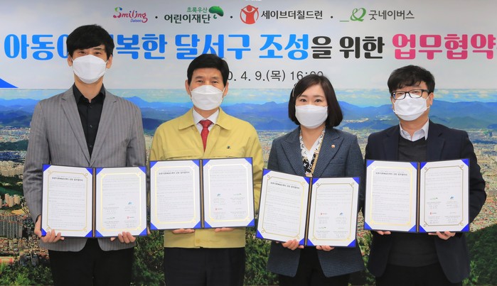 이날 협약식은 이태훈 달서구청장, 초록우산 어린이재단 대구지역본부 김동환본부장, 세이브더칠드런 동부지부 박유선지부장, 굿네이버스 대구남부아동보호전문기관 안정하관장 등 관계자들이 참석한 가운데 진행됐다.