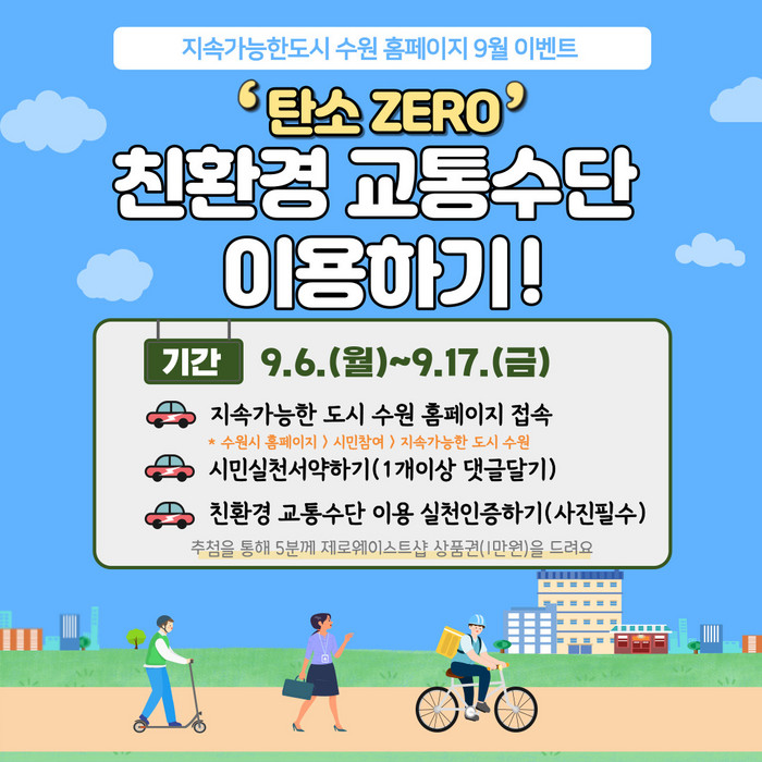 [로컬세계 김병민 기자]경기 수원시는 ‘지속가능한 도시 수원’ 홈페이지 9월 이벤트 ‘탄소 zero, 친환경 교통수단 이용하기’를 오는 6일부터 17일까지 진행한다고 2일 밝혔다.