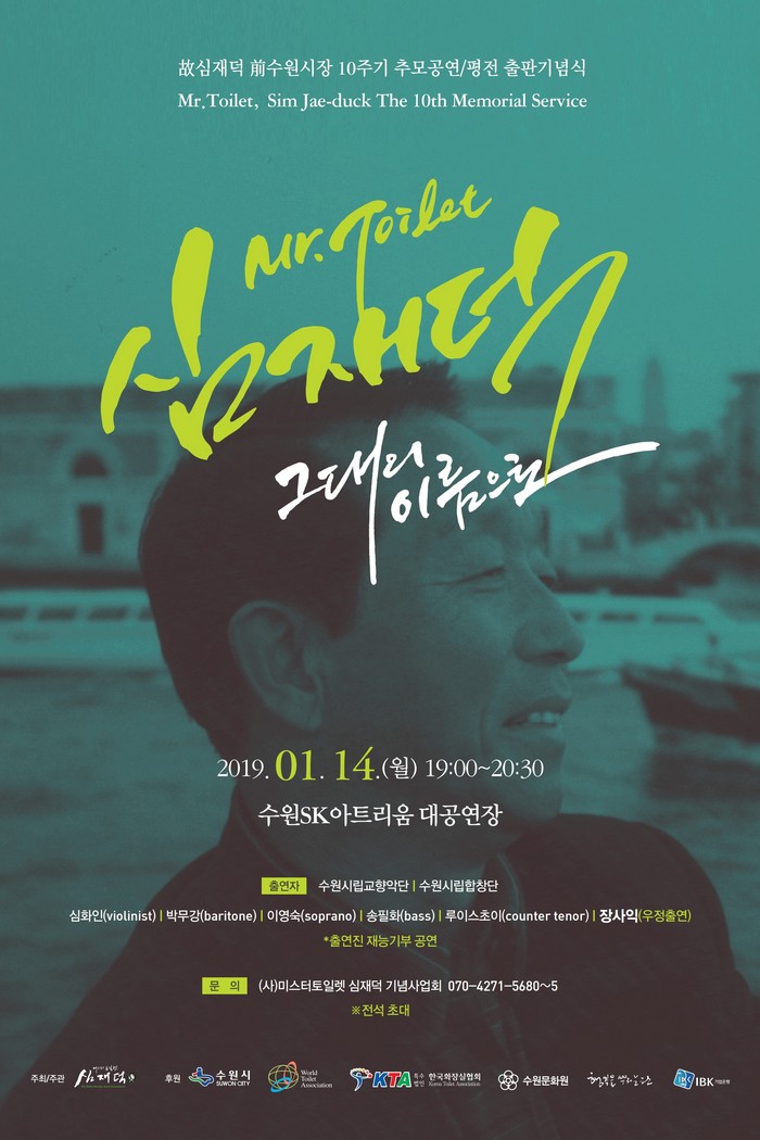 수원시립교향악단·수원시립합창단은 아름다운 음악과 노래를 들려준다. 3부에는 소리꾼 장사익씨가 출연해 노래를 들려준다. '아름다운 화장실 혁명, 미스터 토일렛 심재덕 평전' 출판 기념회도 열린다. 공연에 앞서 오후 6시부터 추모기획 전시가 열린다.