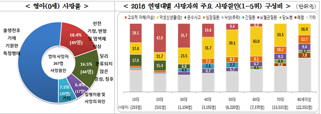 연령별로 보면 30대는 위암·유방암, 40~50대는 간암, 60대 이상은 폐암이 가장 높았으며, 특히 여성 유방암 사망률이 2016년 9.2명(여성 인구 10만명 당)으로 10년 전(2006년 6.8명)보다 2.4명(35.3%) 증가했으며, 30~50대 여성 암 사망 중 유방암이 1위를 차지했다.