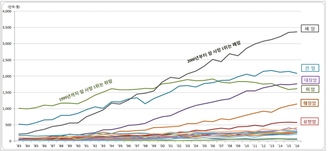 | ▲1983~2016 암종류별 사망자 추이.(경기도 제공) |