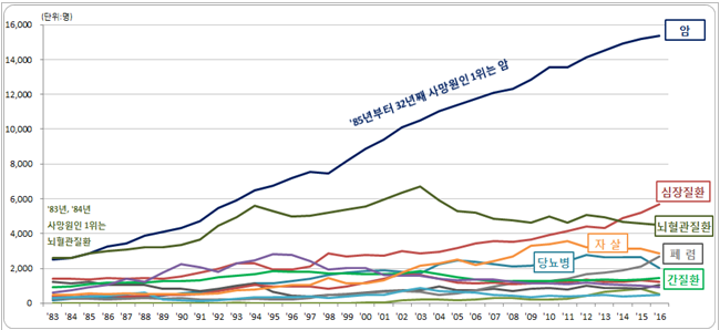 | ▲1983~2016년 주요 사망원인별 사망자 수 추이. |